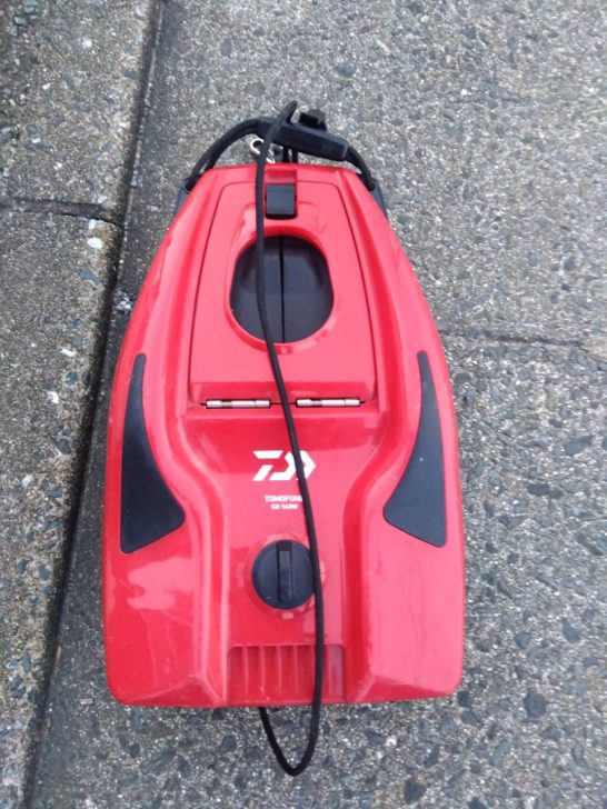 釣りの最中に上流からどんぶらこ・どんぶらこと赤い舟が流れてきたので確保しています。